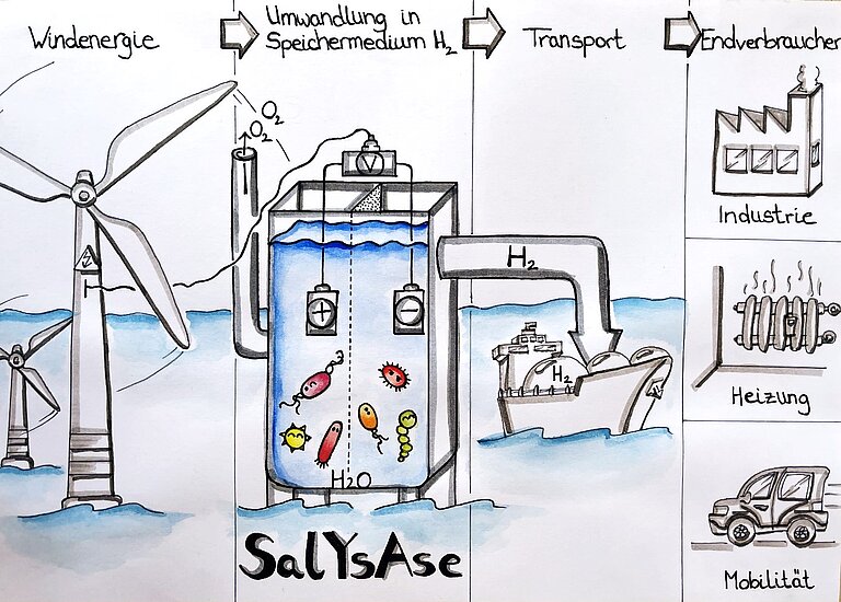 Ziel des CAPTN Energy Projektes „SalYsAse“ ist diesbezüglich die Entwicklung eines neuartigen Verfahrens zur Gewinnung von Wasserstoff direkt aus Meerwasser. Dies soll mit Hilfe von marinen Mikroben an porösen Titangasdiffusionsschichten geschehen, um den Prozess kostengünstig in unmittelbarer Nähe der Offshore-Windkraftanlagen durchführen zu können. Dabei sollen marine, mikrobielle Konsortien etabliert werden, die unter den herausfordernden Bedingungen der Salzwasserelektrolyse die Wasserstoffproduktion optimal unterstützen. Die biokatalytische Aktivität soll dabei eine Reduzierung der Überspannung bewirken, vermeintliche Nebenreaktionen minimieren und eine vorherige Wasseraufreinigung überflüssig machen.